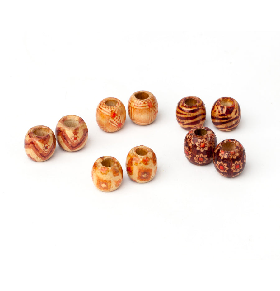 Large wooden hair beads are hair beads used in large sizes for braided hair in thicker strands or dreadlocks. Lacquered surface.